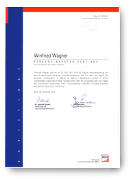 Im Jahre 2009 wurde dem BDU seitens der European Confederation of Search & Selection Associations ECSSA das alleinige Recht übertragen, in Deutschland den international anerkannten Titel „Personalberater CERC/BDU" nach bestimmten Kriterien zu verleihen. Das Zertifikat „Personalberater CERC/BDU" wird nur an Personen verliehen, deren Tätigkeitsschwerpunkt in der Suche und Auswahl von Fach- und Führungskräften (=Personalberatung) liegt und die durch eine regelmäßige Fortbildung in Managementfragen einen Mehrwert für den Klienten gewährleisten. Herr Winfried Wagner wurde im Dezember 2009 mit diesem Titel "Personalberater CERC/BDU" ausgezeichnet